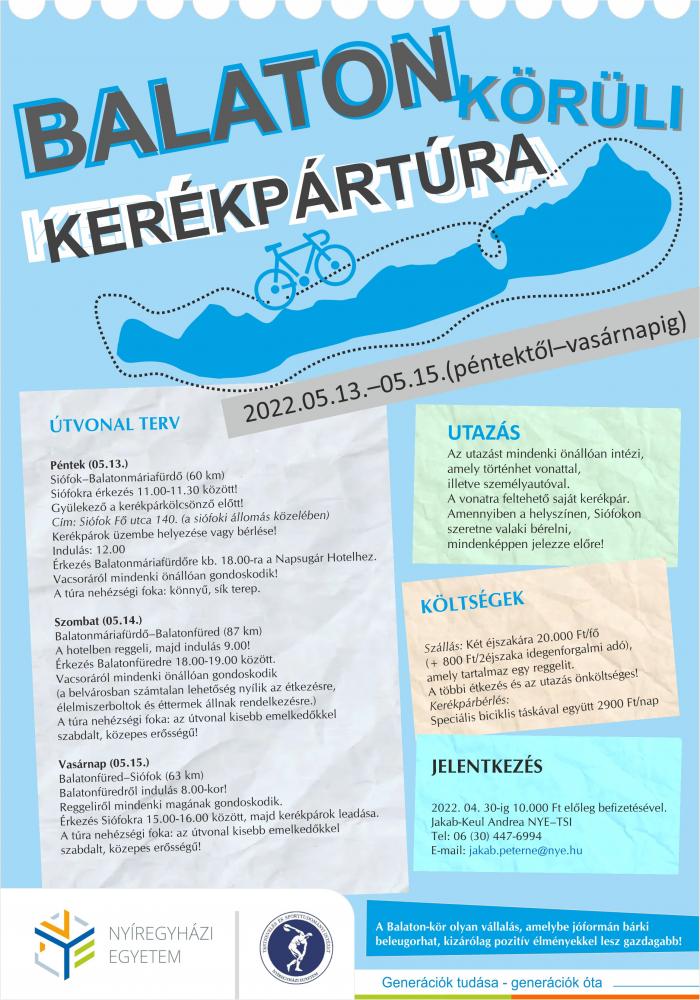 A Nyíregyházi Egyetem Testnevelés és Sporttudományi Intézete Balaton körüli kerékpártúrát szervez 2022.05.13.-05.15. (péntektől vasárnapig).