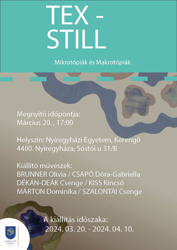 Március 20-án nyílt TEX-STILL kiállítás, Mikrotópiák és Makrotópiák alcímmel a Nyíregyházi Egyetem D épületének kerengőjében, melyen Brunner Olívia, Csapó Dóra-Gabriella, Dékán-Deák Csenge, Kiss Kincső, Márton Dominika és Szalontai Csenge textilből készült alkotásait tekinthetik meg a látogatók.
