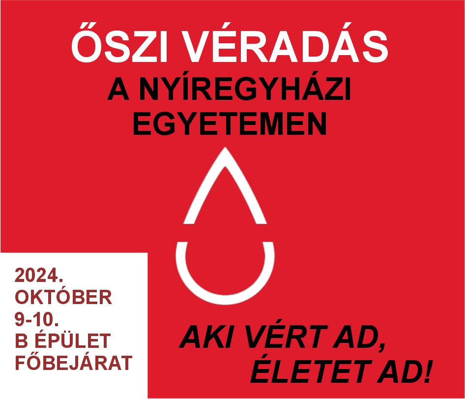 Véradás lesz az egyetemen. Rád is számítunk! 2024. október 9-én (szerdán) és 10-én (csütörtökön) várjuk a véradókat a Nyíregyházi Egyetemen. Az egyetem, a Magyar Vöröskereszt Szabolcs-Szatmár-Bereg Vármegyei Szervezete és az Országos Vérellátó Szolgálat által szervezett véradásra mindkét napon 10:00 és 12:30 között érkezhetnek a segítő szándékú véradók, hallgatók, dolgozók, oktatók a "B" tanulmányi épület bejáratánál, a szokásos helyszínen.
