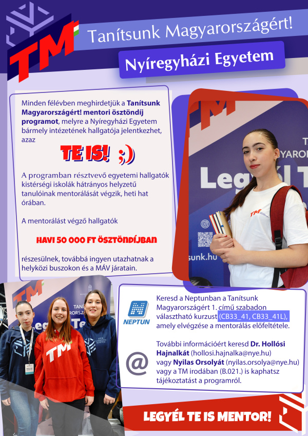 Keresd a Neptunban a Tanítsunk Magyarországért 1. című szabadon választható kurzust , további információt pedig a TM programirodában (B. ép. fsz. 021) kaphatsz.