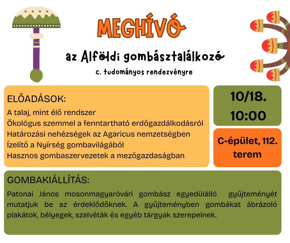 Ezt követően tudományos előadások várják az érdeklődőket, amelyek egyaránt hasznosak kezdő és tapasztalt gombászok számára. Szó lesz többek között a talaj és a gombák kapcsolatáról, a fenntartható erdőgazdálkodásról, a csiperkefélék határozásának nehézségeiről, a Nyírség gombavilágáról, valamint a mezőgazdaságban hasznos gombaszervezetekről.