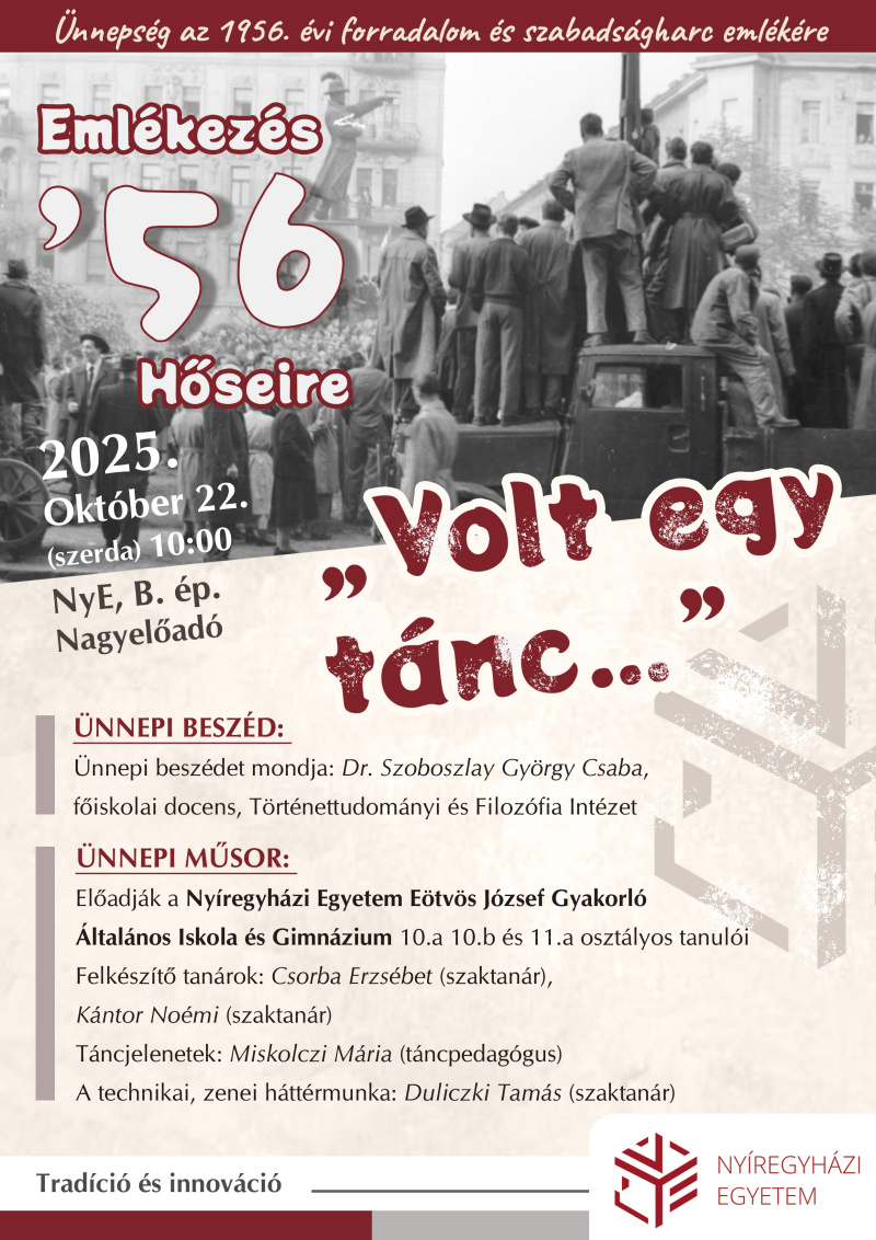 A Nyíregyházi Egyetem tisztelettel meghívja az egyetem polgárait az 1956-os forradalom és szabadságharc hőseire emlékező ünnepségre, amelyet 2025. október 22-én, szerdán 10.00 órától tartunk a B épület Nagyelőadójában.