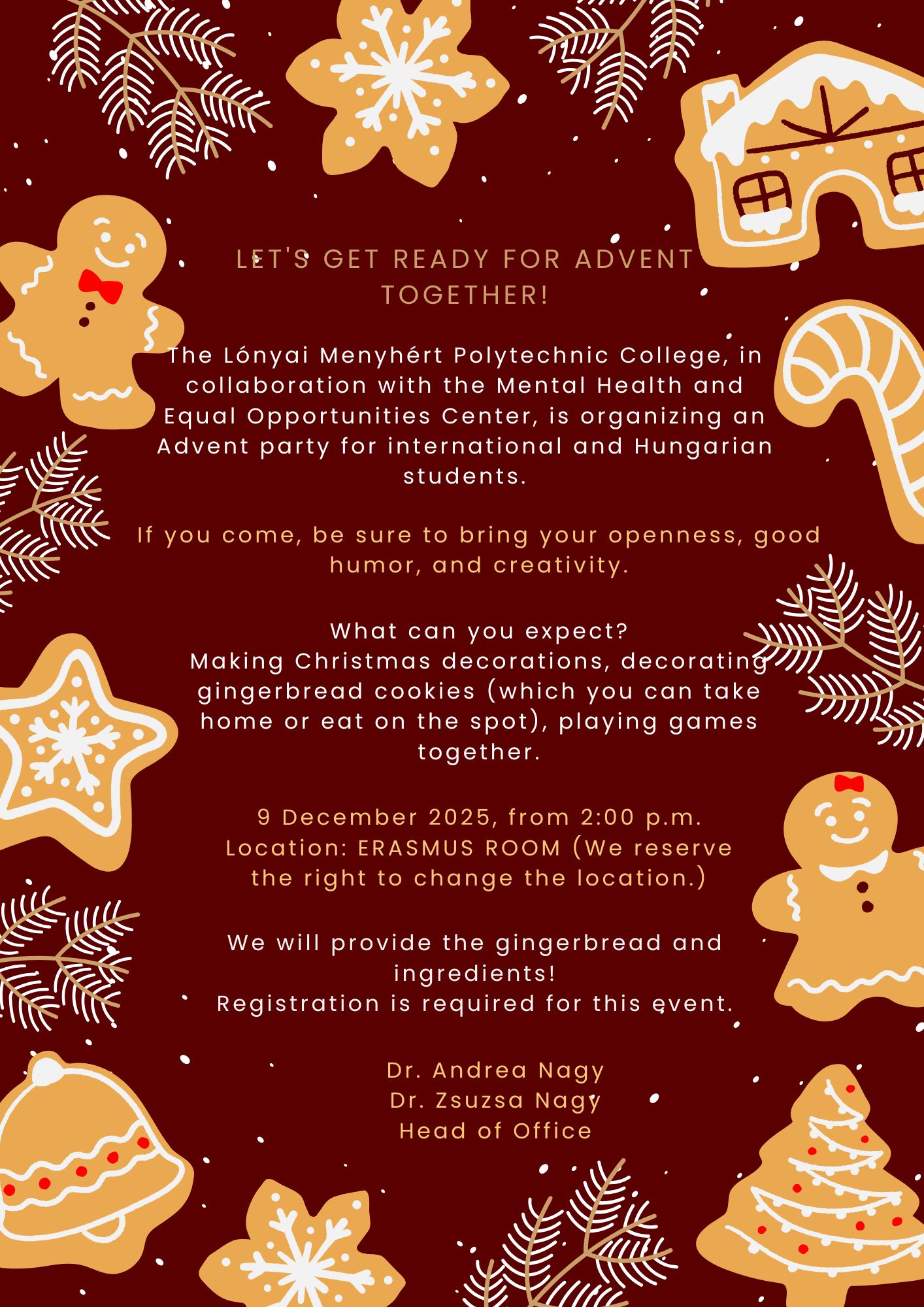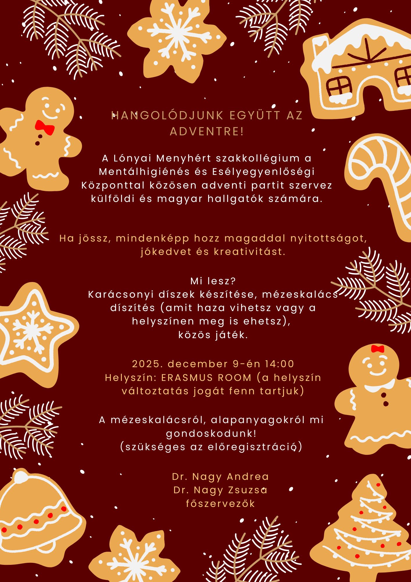 2025. december 9., kedd 14:00 Kultúra Események Adventi hangolódás A Mentálhigiénés és Esélyegyenlőségi Központ, valamint a Lónyay Menyhért Szakkollégium közös programja. Részletek hamarosan! Időpont: 2025. december 9., kedd 14:00 Helyszín: ERASMUS ROOM