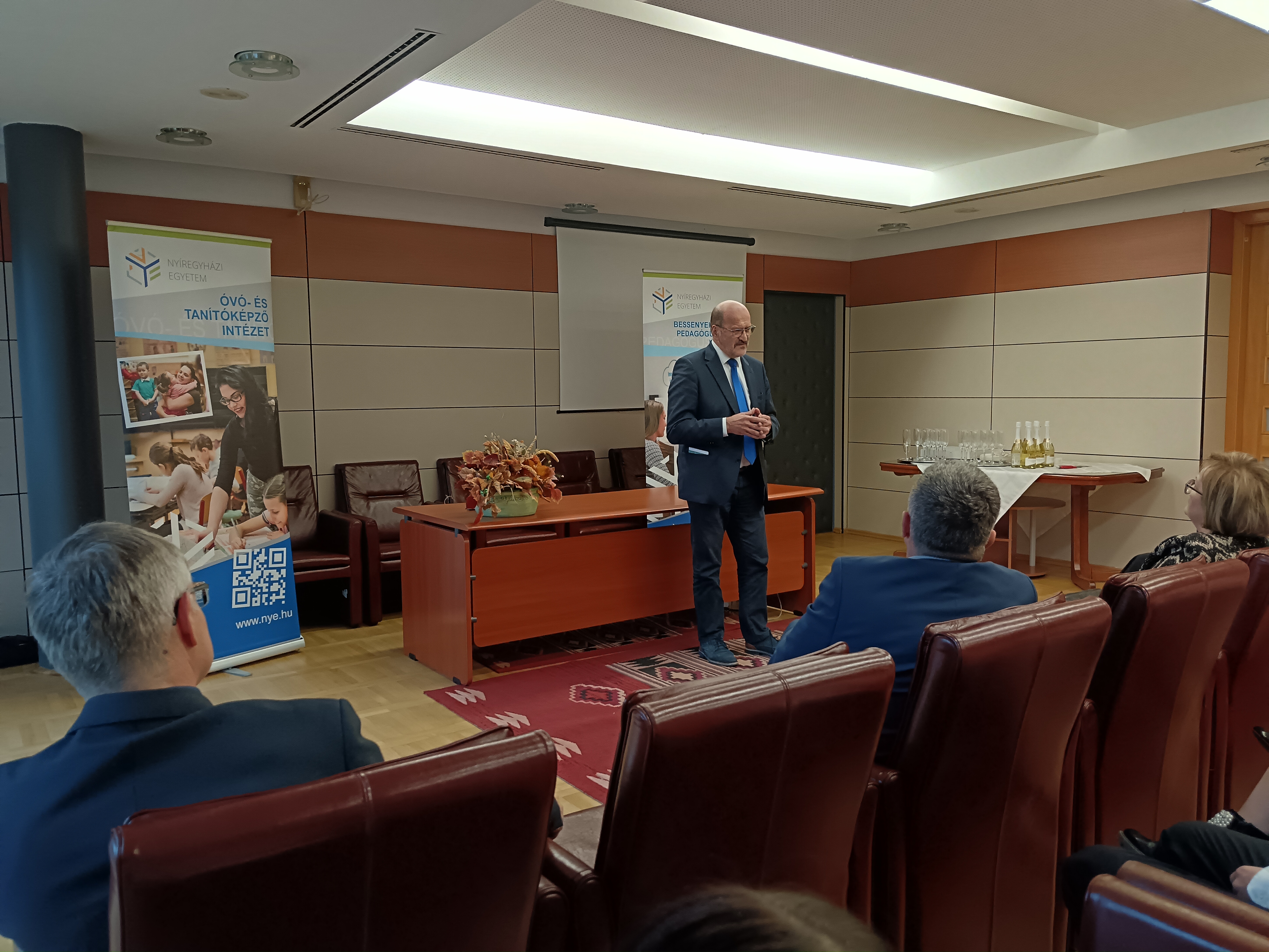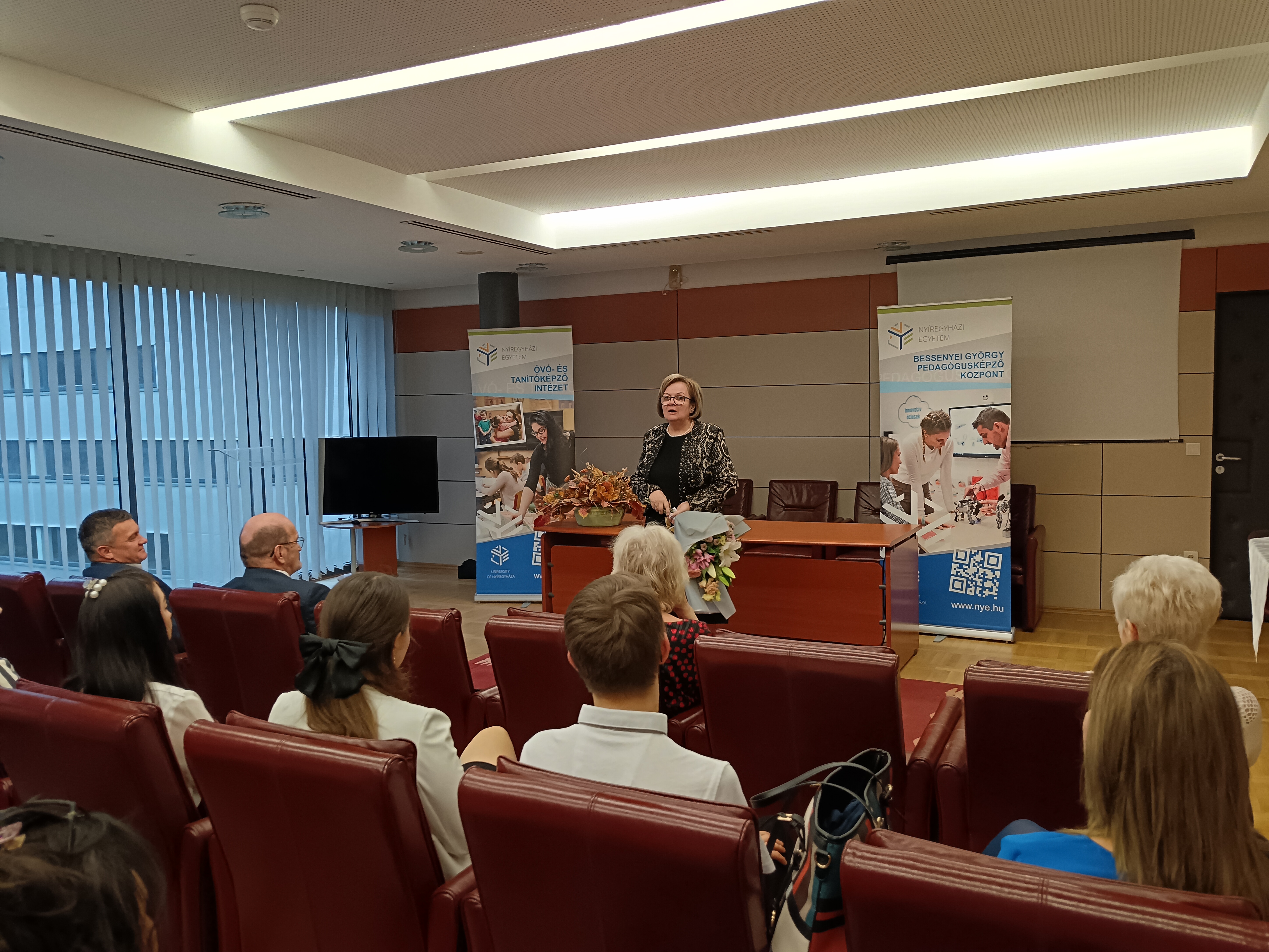2025. december 15-én, nyugdíjba vonulása alkalmából ünnepélyes keretek között köszöntötte egyetemünk vezetése, a Bessenyei György Pedagógusközpont és az Óvó- és Tanítóképző Intézet Dobos Zoltánnét, a Nyíregyházi Egyetem Eötvös József Gyakorló Általános Iskola és Gimnázium gyakorlati képzésért felelős igazgatóhelyettes asszonyát.