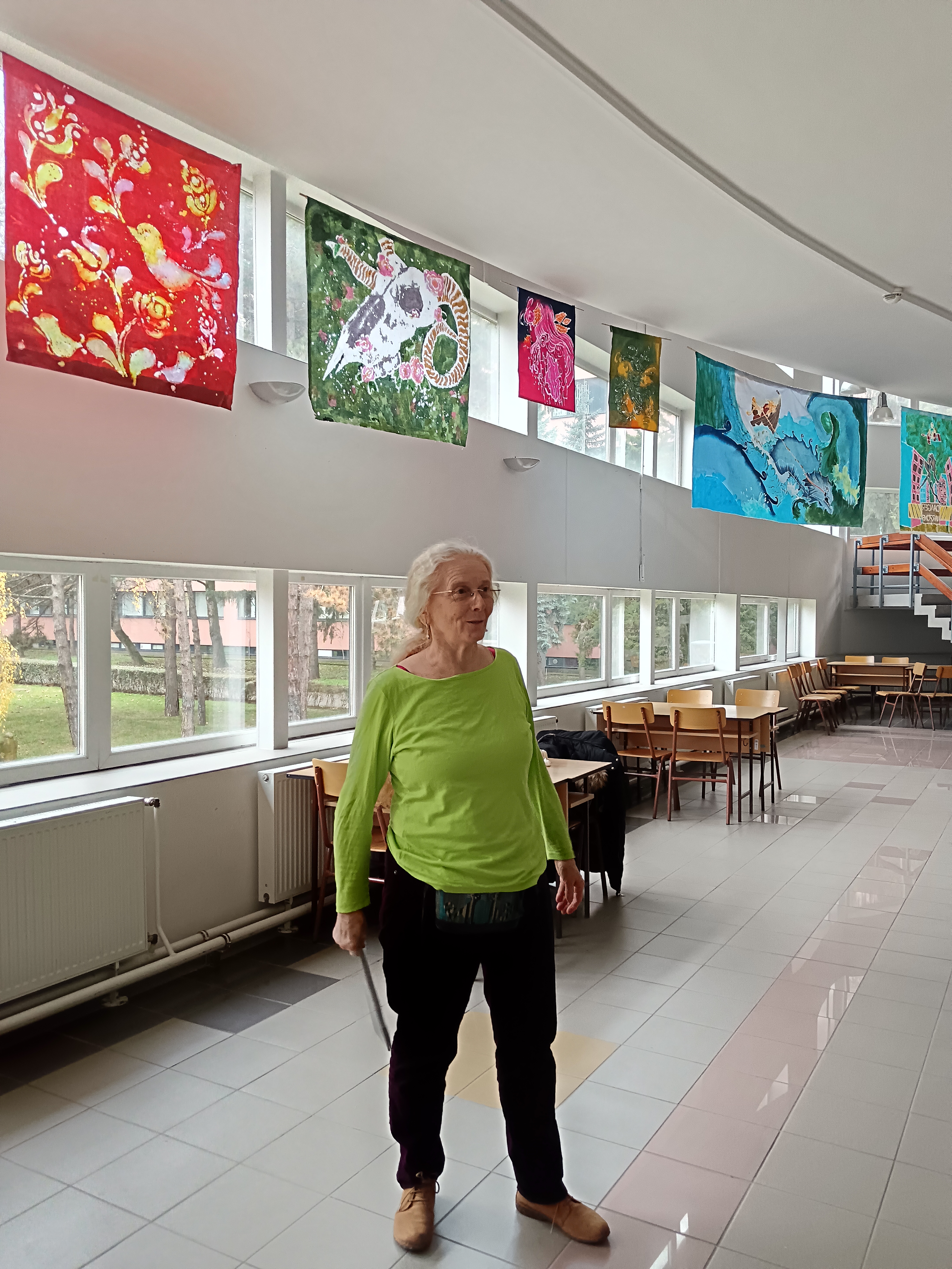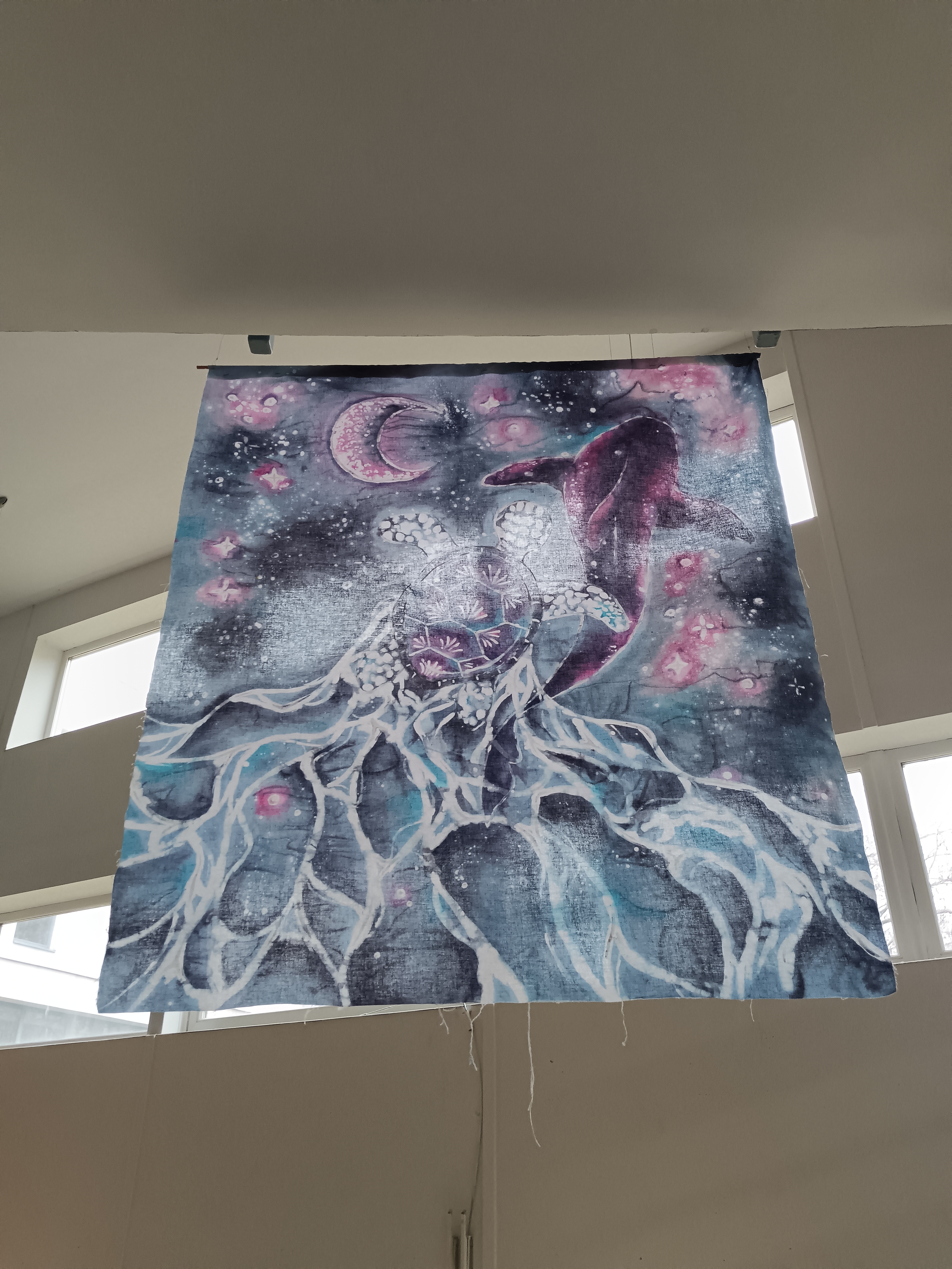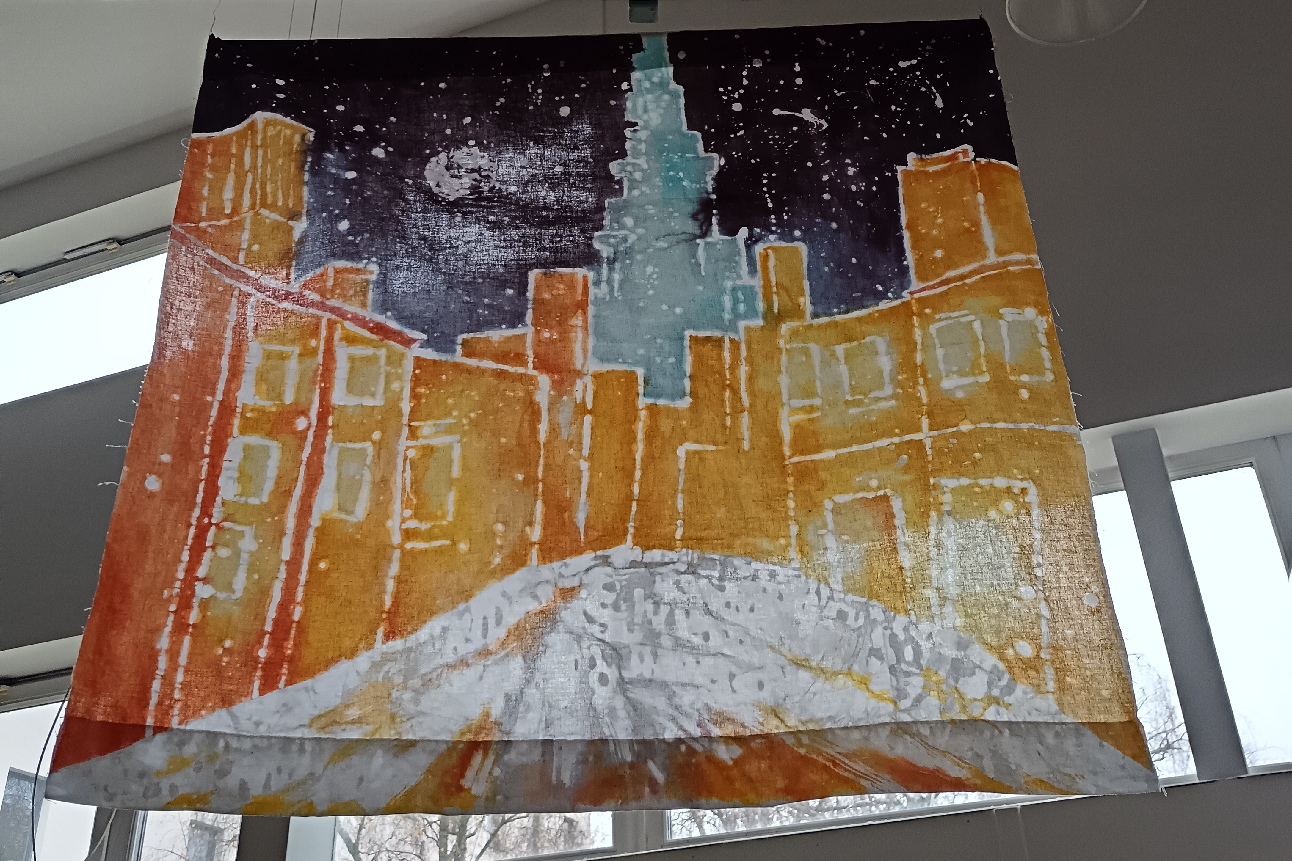 Bár a kiállítás ünnepélyes megnyitóját december 4-én tartották, a batikolt textilek januárban is élményszerű találkozást kínálnak mindazoknak, akik áthaladnak a Kerengőn. A felfüggesztett munkák az ablakok előtt, zsinórra rendezve kaptak helyet, így a beáramló természetes fény a különböző napszakokban újra és újra átírja a látványt. A tárlat az első- és harmadéves hallgatók batikkísérleteiből válogat, bemutatva a technika sokszínűségét és az alkotók egyéni látásmódját. A kiállítást Tóth Lívia DLA textilművész, a Vizuális Kultúra Intézet oktatója nyitotta meg, akivel a megnyitón a batikolás lényegéről és pedagógiai jelentőségéről is beszélgettünk.