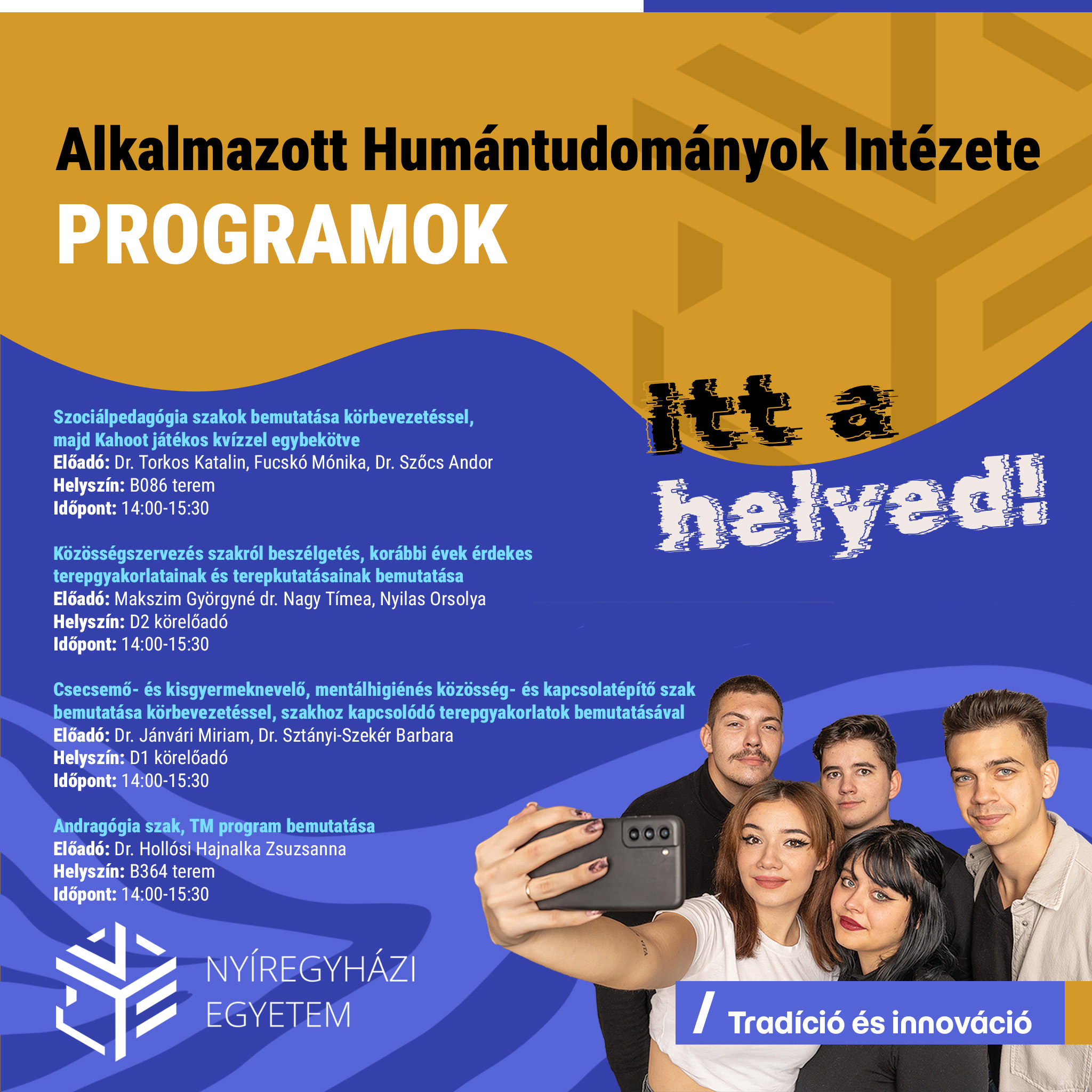 Program: 14:00–15.30 – Dr. Kiss Anita – Dr. Karádi Zsolt: Irány a magyartanár szak! Szakismertető, tájékoztató a felsőfokú tanulmányokra felkészítő kurzusokról, valamint interaktív nyelvhelyességi kvíz.