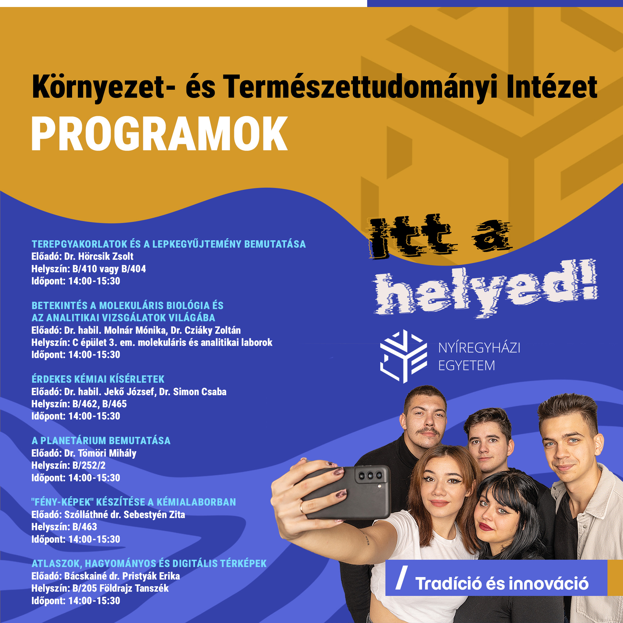 Program: Szakok bemutatása, hallgatói tapasztalatok, kutatási lehetőségek az intézetben.
