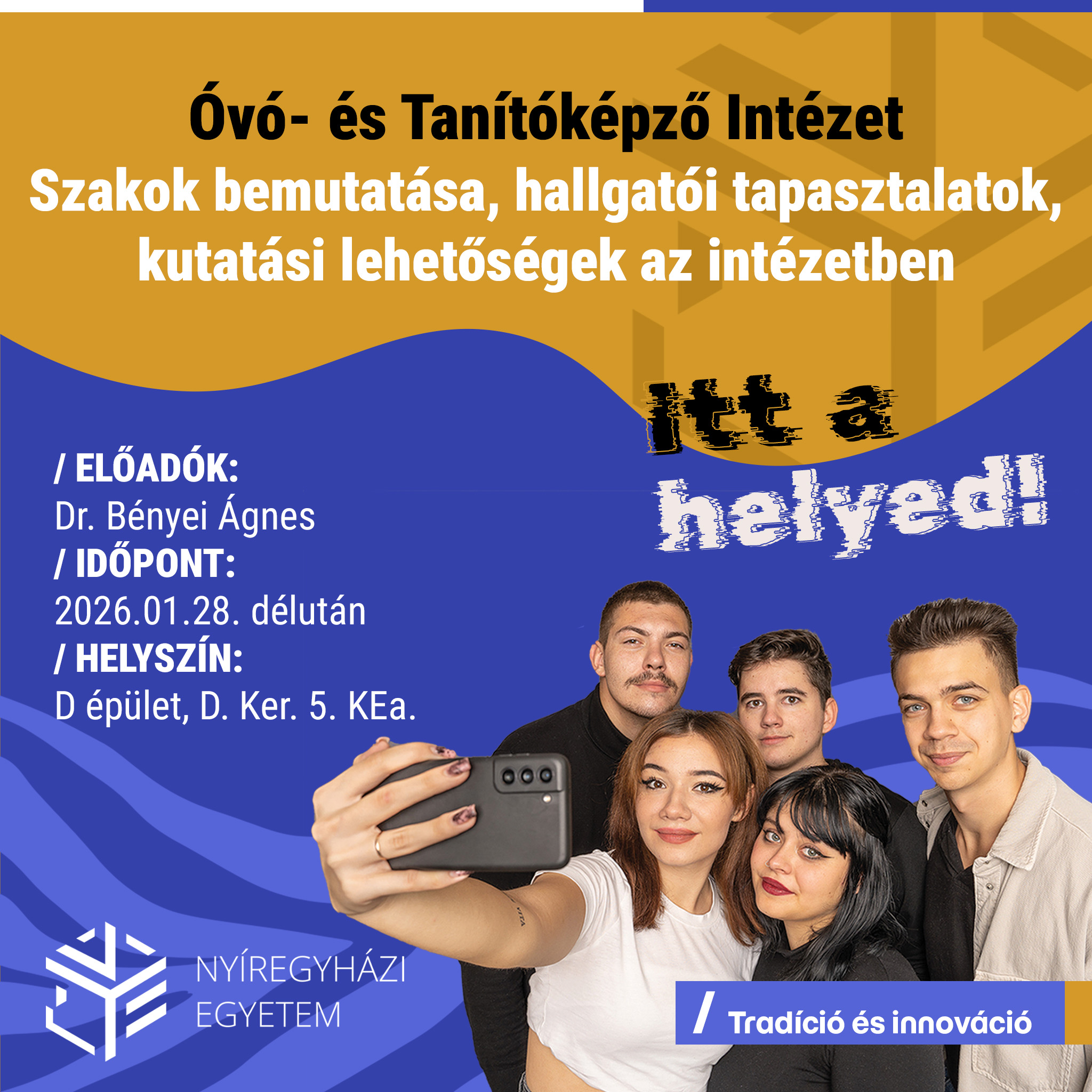 A felvételi döntés meghatározó lépés minden fiatal életében. A Nyíregyházi Egyetem ezért 2026. január 28-án, szerdán 13 órától Felvételi Élménynapot szervez a „B” épület Nagyelőadó termében, ahol az érdeklődők átfogó képet kaphatnak az intézmény kínálatáról, közösségi életéről és a sikeres felvételihez vezető útról. Az előadást követően intézeti és laborlátogatások, személyes konzultációk is várják a diákokat és pedagógusokat.