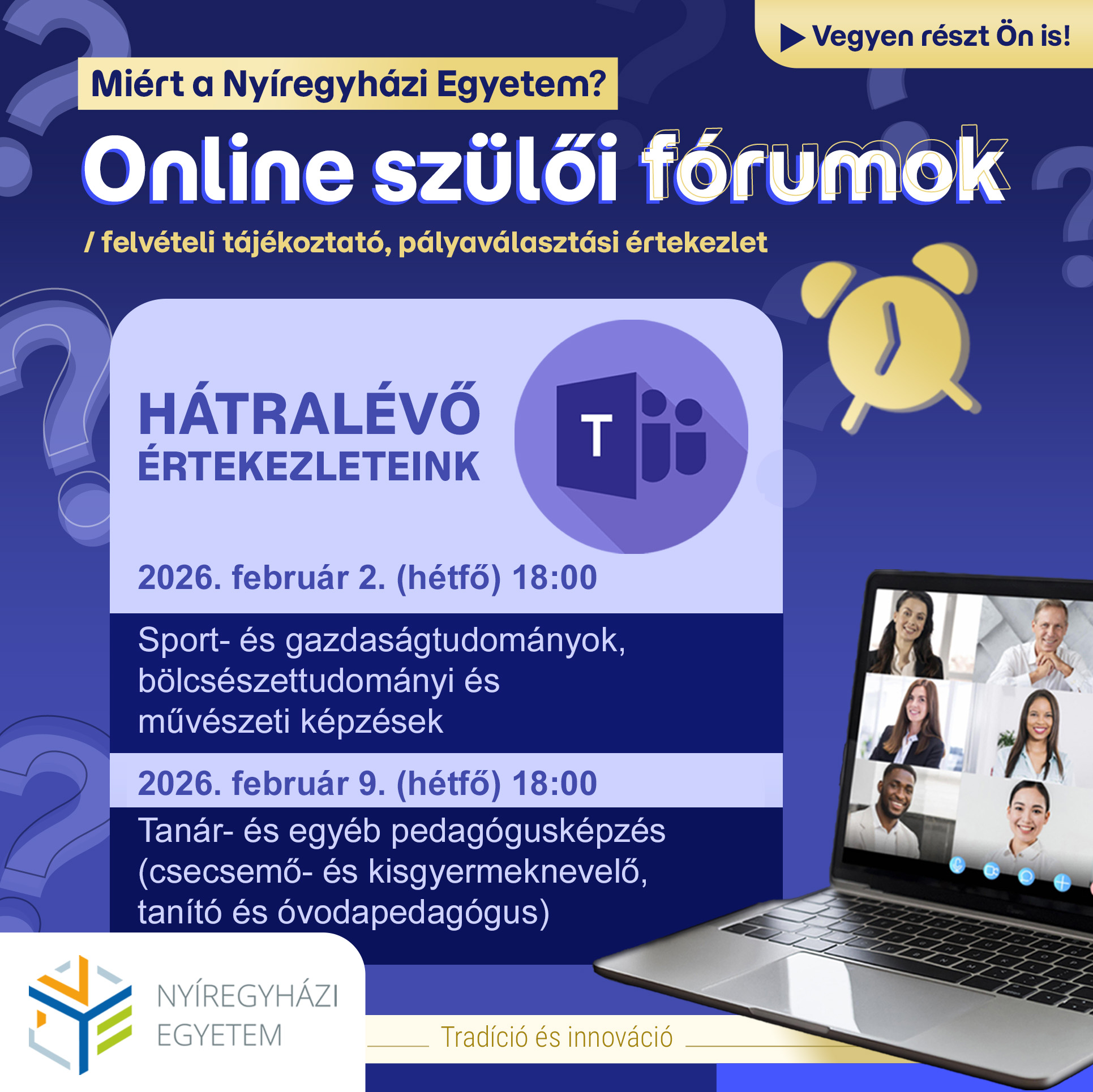 A Nyíregyházi Egyetem harmadik alkalommal tart online szülői fórumot 2026. február 2-án, hétfőn 18 órától. Az esemény célja, hogy átfogó, közérthető segítséget nyújtson a felsőoktatási jelentkezés előtt álló diákoknak és családjaiknak.