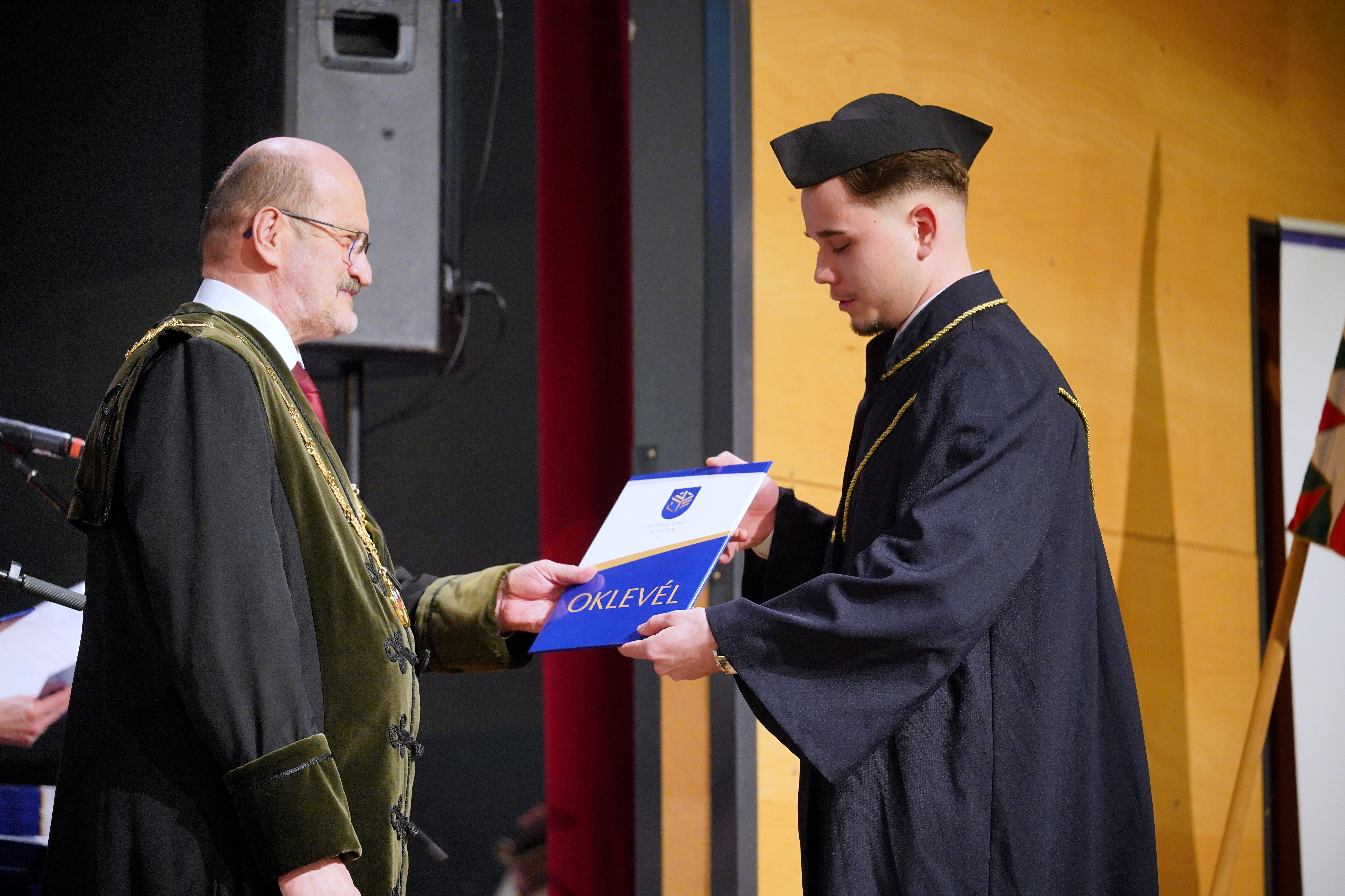 A beszédeket követően a 185 végzett hallgató ünnepélyes keretek között dr. Szabó György rektortól vehette át oklevelét.