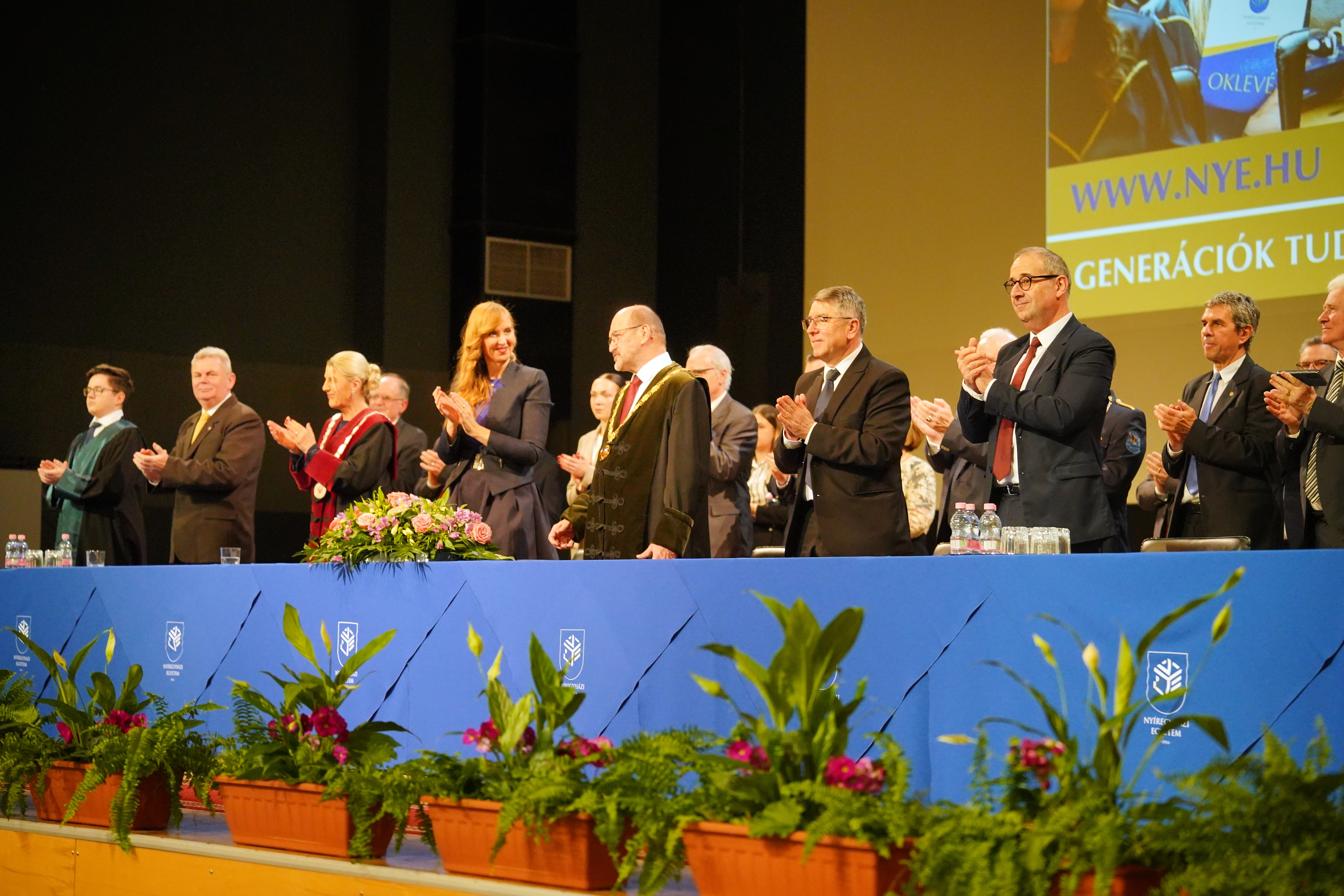 Dr. Szabó György rektor ünnepi beszédében az egyetemet, mint folyamatosan fejlődő, ugyanakkor hagyományaira építő intézményt mutatta be. Elmondta, hogy a képzési palettát folyamatosan bővítik és fejlesztik, különös hangsúlyt fektetve a gyakorlatközpontú oktatásra, a kutatás-fejlesztés támogatására, valamint a hazai és nemzetközi kapcsolatok erősítésére. Köszönetet mondott azoknak a szakkollégista és tudományos diákköri hallgatóknak, akik a kötelező tanulmányokon túl is bekapcsolódtak az egyetem tudományos munkájába, és elismeréssel szólt arról az 53 magyar és nemzetközi hallgatóról, akik a 37. Országos Tudományos Diákköri Konferencián képviselték eredményesen az intézményt. „Örömmel jelentem be, hogy a Nyíregyházi Egyetem közel 6000 hallgatója közül 2026 januárjában 239-en tettek sikeres záróvizsgát, és megtiszteltetés számomra, hogy közülük 185 végzős hallgatónak személyesen adhatom át az oklevelet, amely nem végállomás, hanem iránytű a megszerzett tudás gyakorlásához” – fogalmazott a rektor.