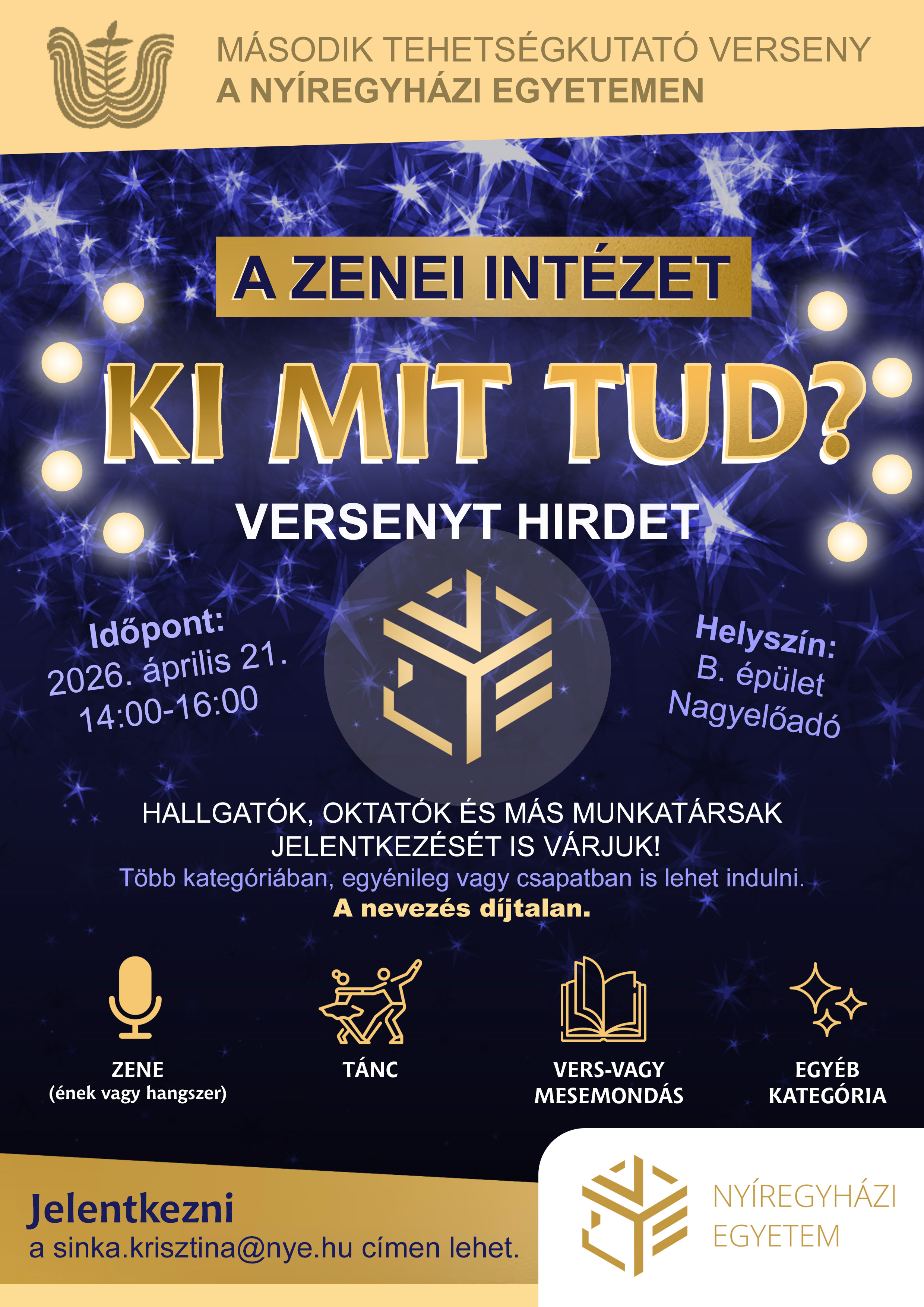 A Nyíregyházi Egyetem Zenei Intézete idén tavasszal hagyományőrző módon második alkalommal szervez „KI MIT TUD?" tehetségkutató versenyt.