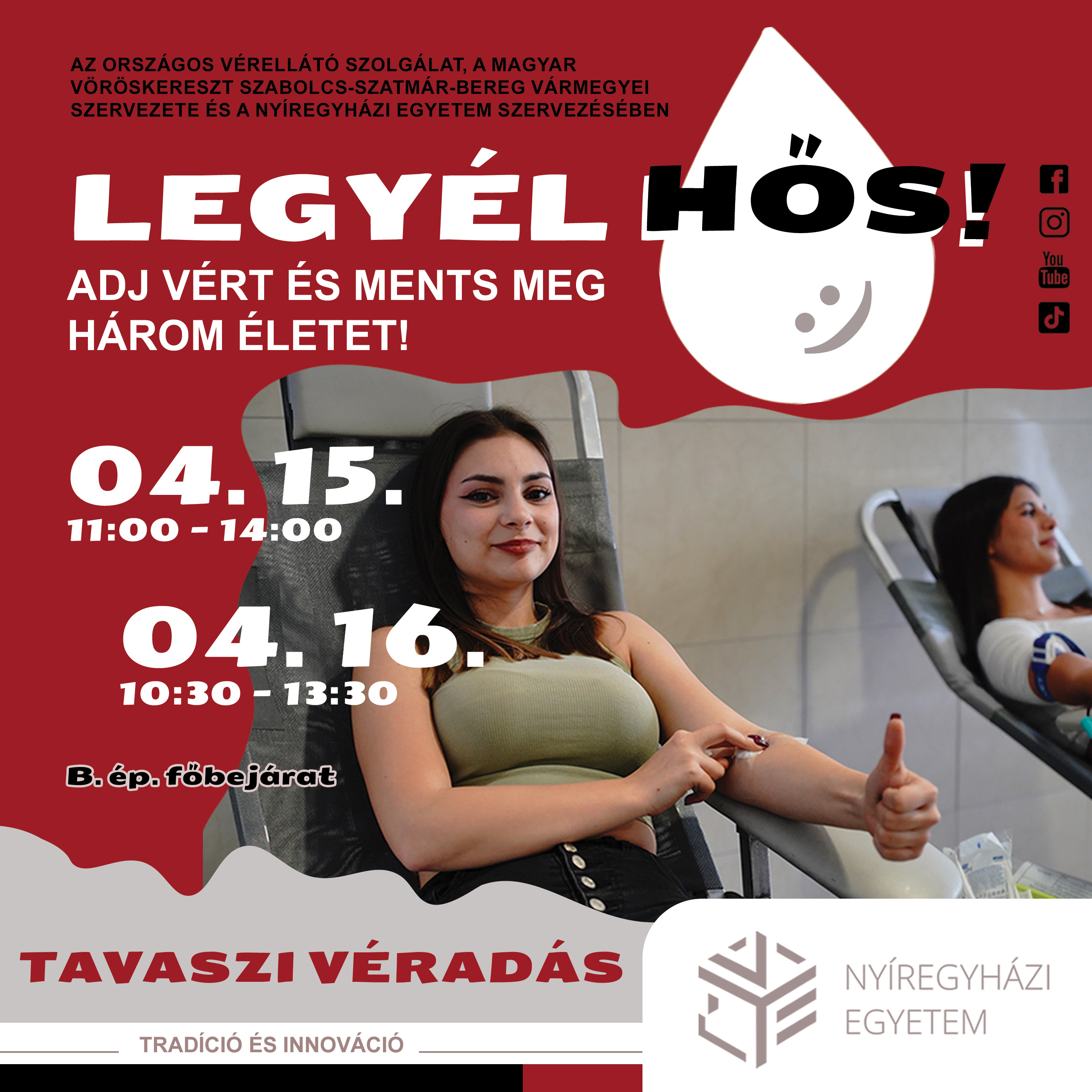 Áprilisban két napon keresztül várják a véradókat a Nyíregyházi Egyetemen. 2026. április 15-én 11:00 és 14:00 óra között, április 16-án pedig 10:30 és 13:30 között a B épület főbejáratánál adhatnak vért az önkéntesek.