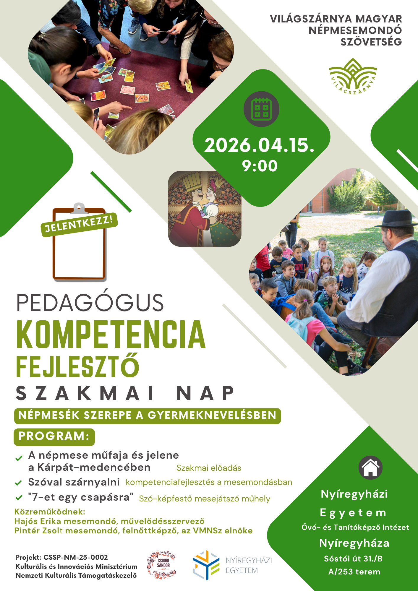 A Nyíregyházi Egyetem Óvó- és Tanítóképző Intézete a Világszárnya Magyar Népmesemondó Szövetséggel közösen szervez szakmai napot 2026. április 15-én „Népmesék szerepe a gyermeknevelésben” címmel, ahol a pedagógusok a mesemondás fejlesztő erejével és gyakorlati módszereivel ismerkedhetnek meg.