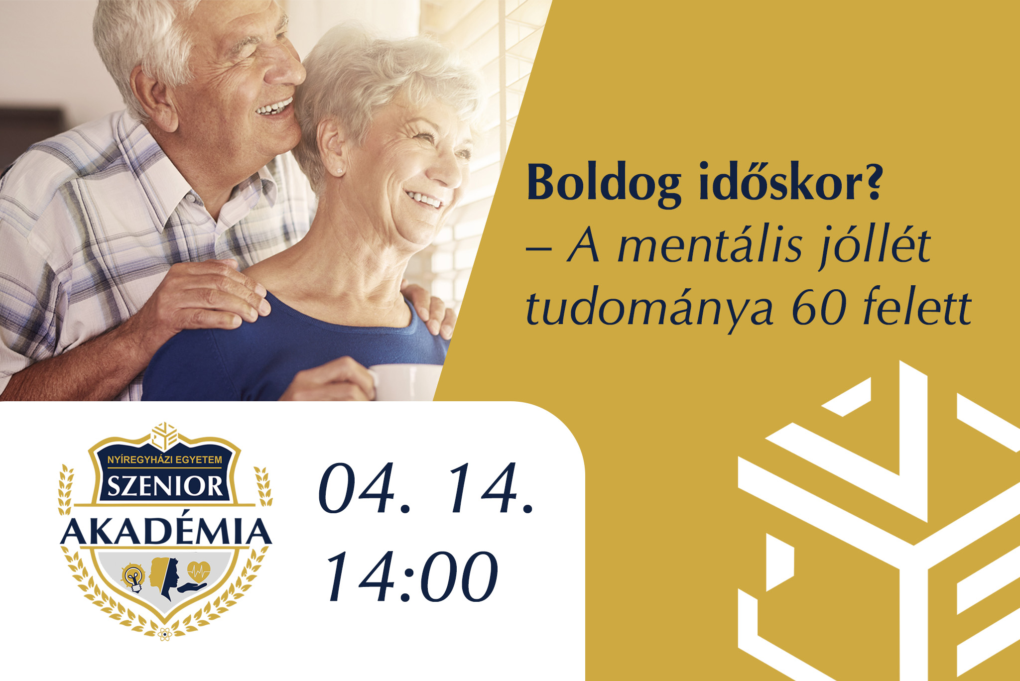 A „Boldog időskor? – A mentális jóllét tudománya 60 felett” című előadás során szó lesz az életminőség megőrzéséről, a lelki egészség fontosságáról, a társas kapcsolatok erejéről, valamint arról, hogyan fejleszthető a lelki ellenállóképesség időskorban is. Az előadó, Tóthné dr. Kerülő Judit a Nyíregyházi Egyetem nyugalmazott főiskolai tanára, az Alkalmazott Humántudományok Intézet óraadó oktatója.