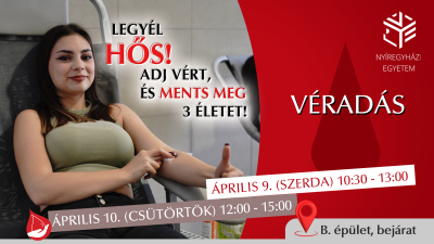 A Felsőoktatási Véradó Hetek programsorozatat keretében rendezik meg április 9-én (szerdán) és 10-én (csütörtökön) a tavaszi véradást a Nyíregyházi Egyetemen, ahová idén is várják az önkénteseket. Az Országos Vérellátó Szolgálat és a Magyar Vöröskereszt közös kampánya az elmúlt évekhez hasonlóan a szorgalmi időszak alatt zajlik. A szervezetek célja, hogy minél több fiatalt buzdítsanak véradásra. Az országos kezdeményezéshez a Nyíregyházi Egyetem idén is csatlakozik.