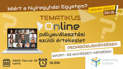A pedagógus-, a sport és a művészeti képzések kerülnek fókuszba február 10-én, hétfőn a Nyíregyházi Egyetem utolsó online szülő értekezletén. Az intézmény januártól összesen négy ilyen tematikus tájékoztatót szervezett, azzal a céllal, hogy az érdeklődők részletes információkhoz jussanak a felvételi eljárás mellett a szeptemberben induló képzésekről.