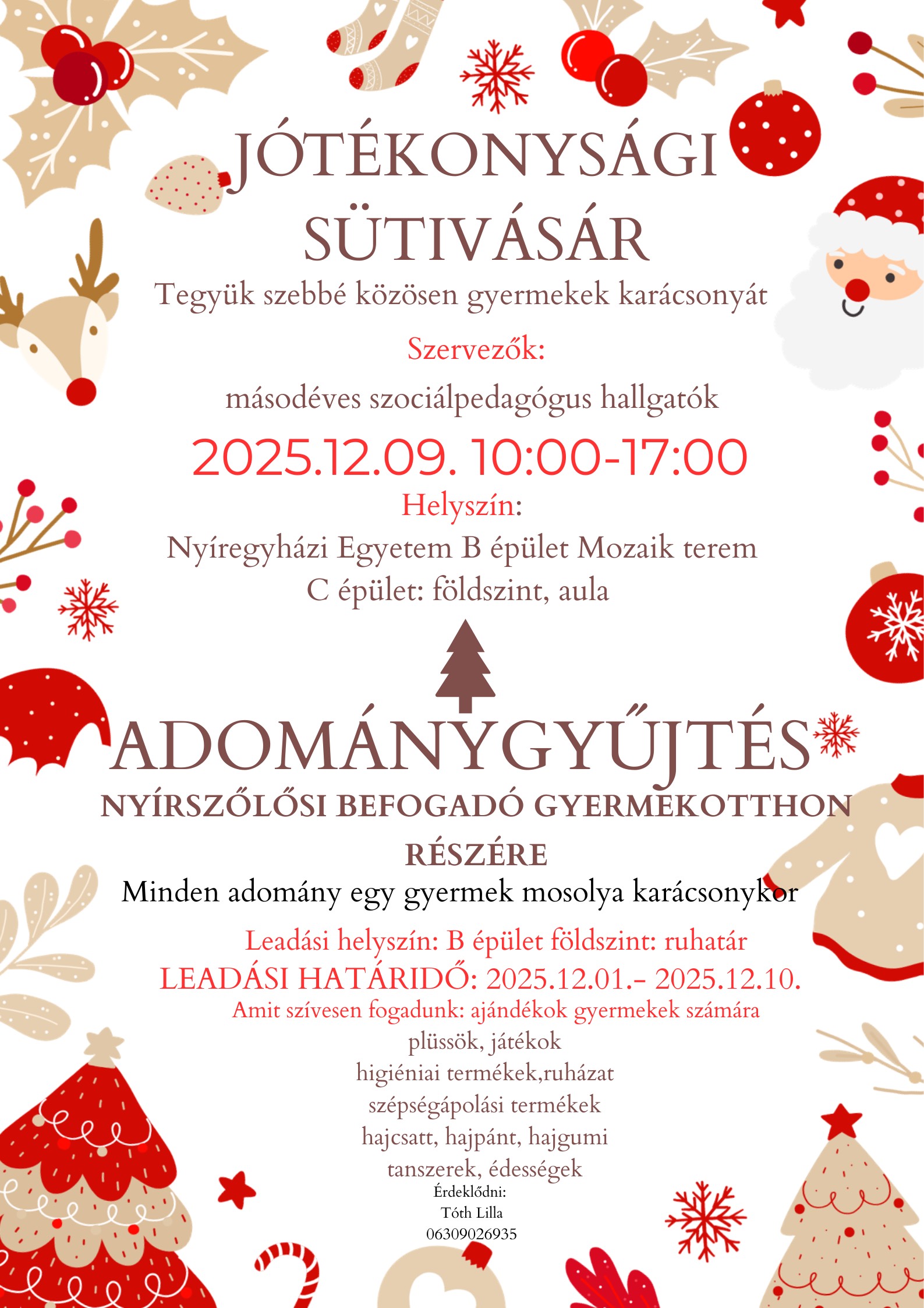 A Mikulás 2025. december 3-án (szerdán) 17.00-18.00 között a Nyíregyházi Egyetemre látogat, hogy megajándékozza az intézményben dolgozók csemetéit. Amíg a gyerekek várják a Mikulást, a nyíregyházi Vidám Manók Együttes interaktív koncertjén énekelhetnek, táncolhatnak.