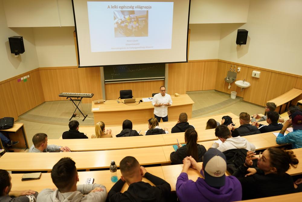 A közel 80 fős, hallgatókból, oktatókból és egyetemi munkatársakból szerveződő, érdeklődő hallgatóság számára Körei László központvezető úr tartott tudománynépszerűsítő előadást. Az alkalomhoz illő rövid zenei műsorral Perge Adrián egyetemi hallgató kedveskedett a közönségnek. Az eseményen rövid etapban bemutatásra kerültek azok a tudományos megállapítások is, melyek „Körei László: Munkahelyi és szervezeti mentálhigiéné – teoretikus és praktikus megközelítések” című könyvében, a szerző többéves, a területen végzett tudományos munkájának eredményeire alapulnak, melyet a neves akadémikus professzor, Csepeli György szociálpszichológus is méltatva lektorált a közelmúltban.