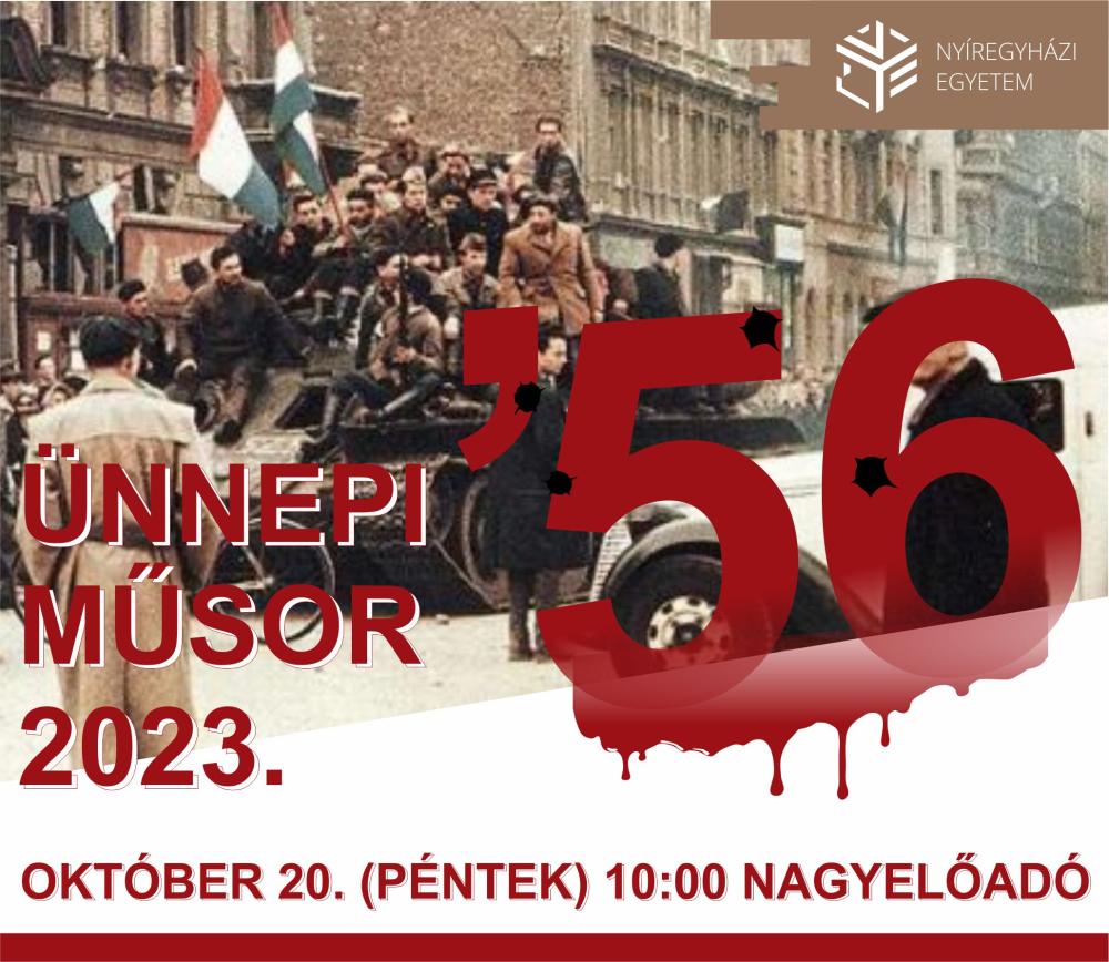 A Nyíregyházi Egyetem vezetősége meghívja Önt az 1956-os forradalom és szabadságharc tiszteletére rendezett ünnepi megemlékezésre 2023. október 20. (péntek) 10:00 órára, a „B” épület Nagyelőadó termébe.