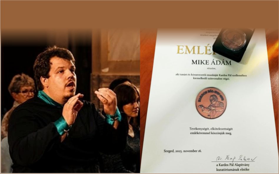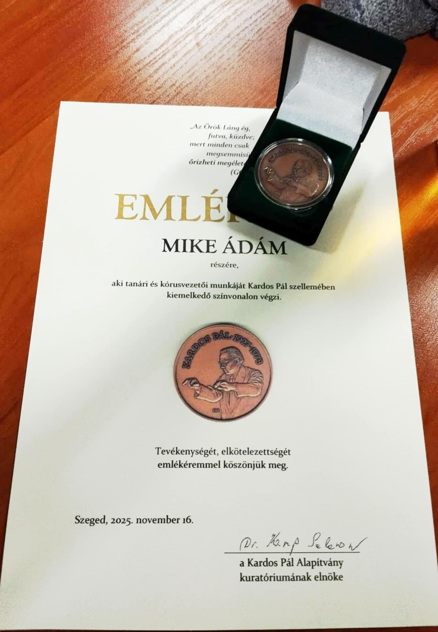 A Kardos Pál Alapítvány 2025. november 16-án kiemelkedő színvonalú tanári és karvezetői munkájáért Kardos Pál emlékérmet adományozott Mike Ádámnak, a Zenei Intézet oktatójának, a Sol Oriens Kórus karnagyának.