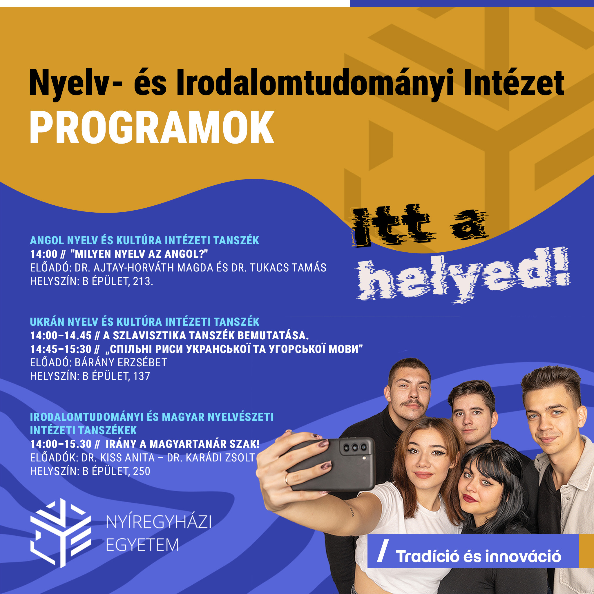 Program: 14:00–15.30 – Dr. Kiss Anita – Dr. Karádi Zsolt: Irány a magyartanár szak! Szakismertető, tájékoztató a felsőfokú tanulmányokra felkészítő kurzusokról, valamint interaktív nyelvhelyességi kvíz.