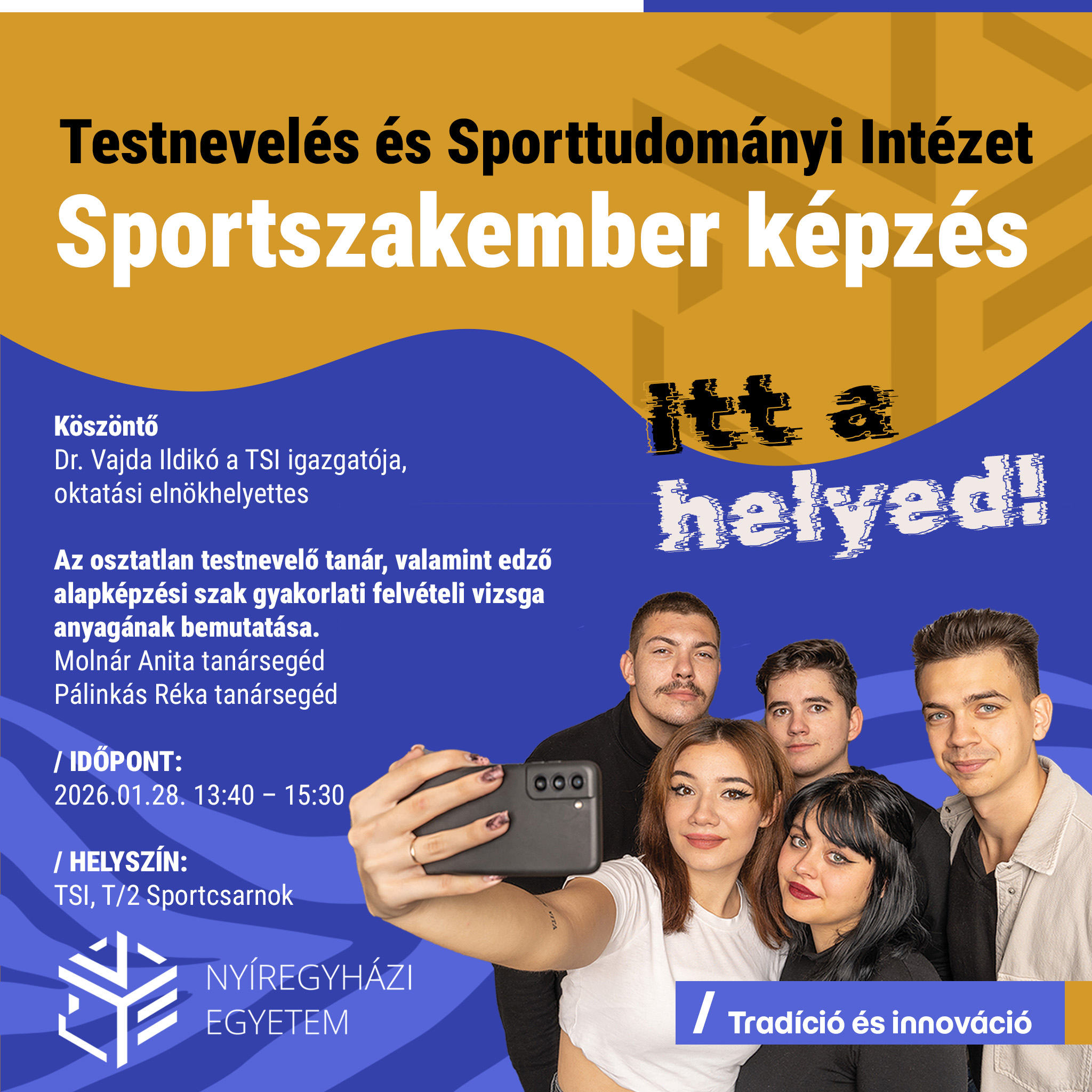 - Sportszakember képzés a Nyíregyházi Egyetem Testnevelés és Sporttudományi Intézetében - köszöntőt mond Dr. Vajda Ildikó a Testnevelés és Sporttudományi Intézet igazgatója, oktatási elnökhelyettes.