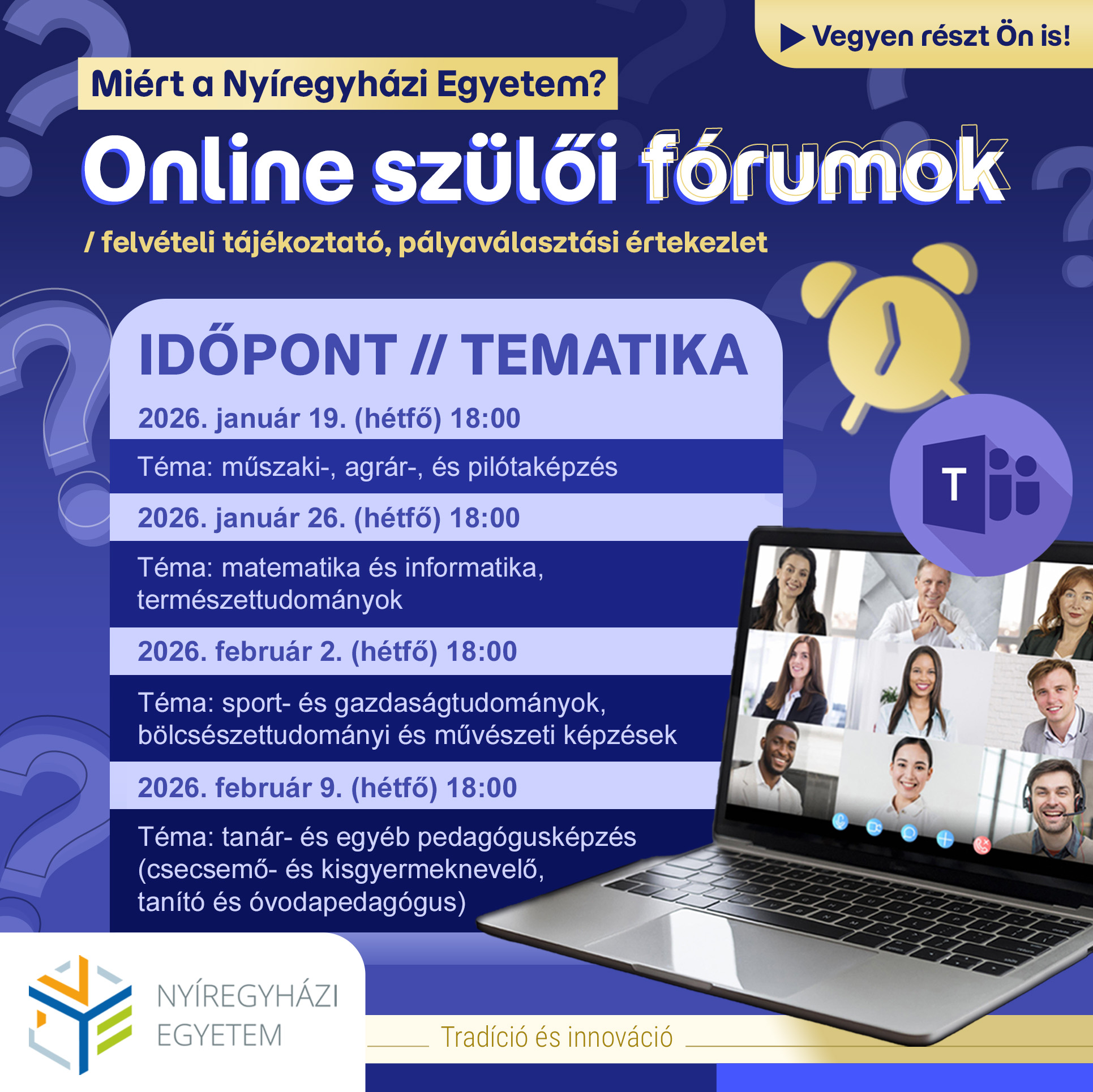 A felvételi időszak hajrájában a Nyíregyházi Egyetem online szülői fórumokkal segíti a továbbtanulás előtt állók döntését. A soron következő online szülői fórum január 26-án, hétfőn 18 órakor kezdődik.