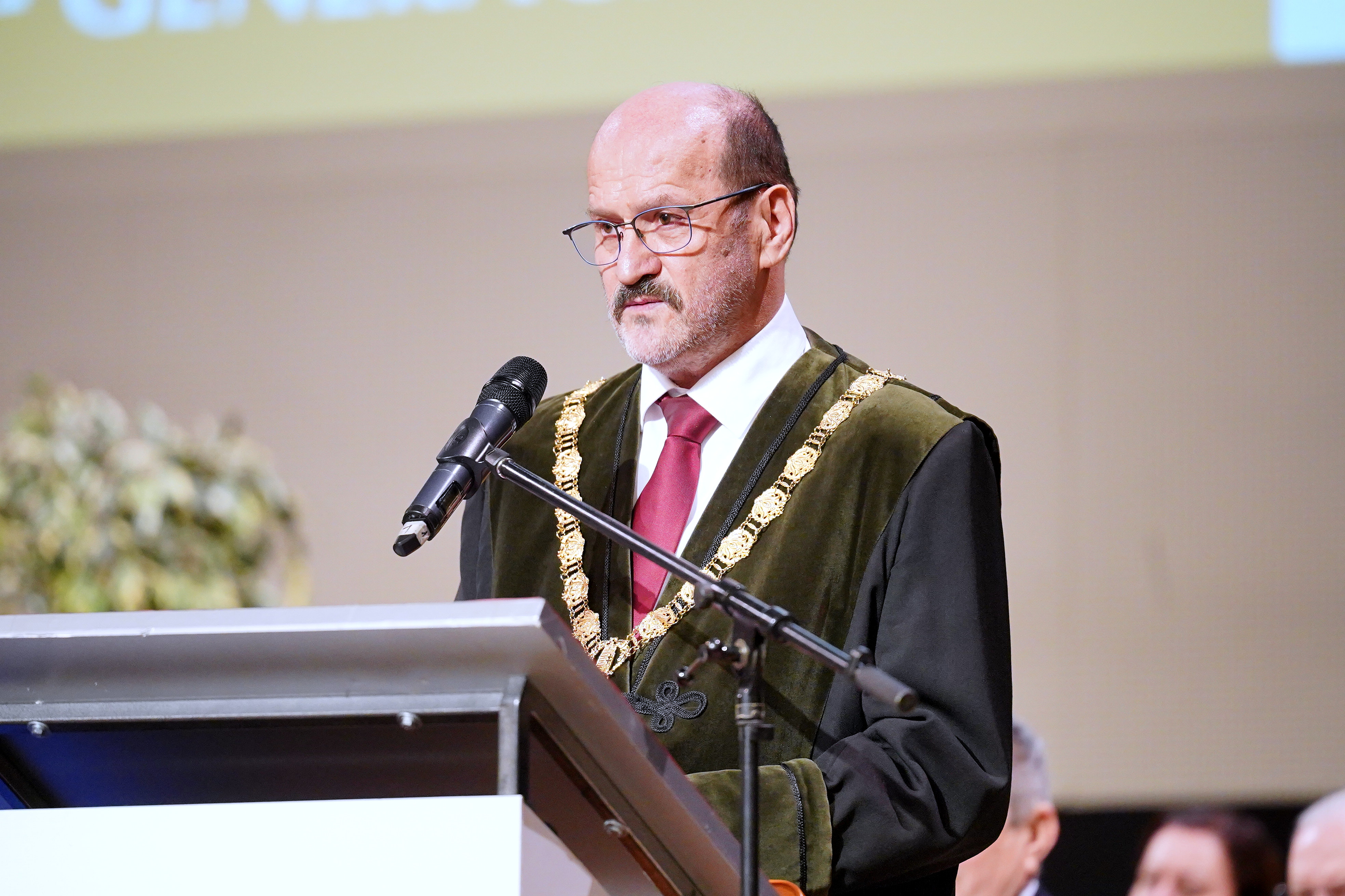 Dr. Szabó György rektor ünnepi beszédében az egyetemet, mint folyamatosan fejlődő, ugyanakkor hagyományaira építő intézményt mutatta be. Elmondta, hogy a képzési palettát folyamatosan bővítik és fejlesztik, különös hangsúlyt fektetve a gyakorlatközpontú oktatásra, a kutatás-fejlesztés támogatására, valamint a hazai és nemzetközi kapcsolatok erősítésére. Köszönetet mondott azoknak a szakkollégista és tudományos diákköri hallgatóknak, akik a kötelező tanulmányokon túl is bekapcsolódtak az egyetem tudományos munkájába, és elismeréssel szólt arról az 53 magyar és nemzetközi hallgatóról, akik a 37. Országos Tudományos Diákköri Konferencián képviselték eredményesen az intézményt. „Örömmel jelentem be, hogy a Nyíregyházi Egyetem közel 6000 hallgatója közül 2026 januárjában 239-en tettek sikeres záróvizsgát, és megtiszteltetés számomra, hogy közülük 185 végzős hallgatónak személyesen adhatom át az oklevelet, amely nem végállomás, hanem iránytű a megszerzett tudás gyakorlásához” – fogalmazott a rektor.