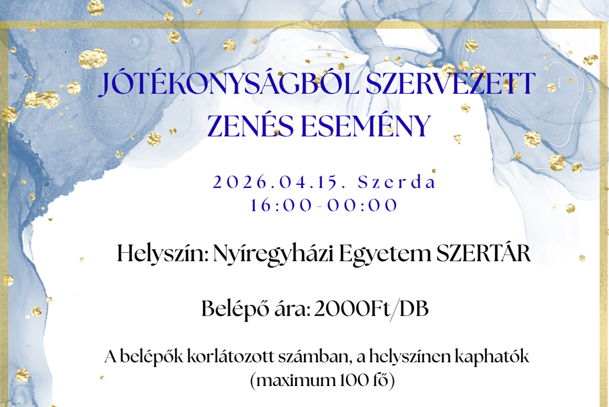 A Nyíregyházi Egyetem szociálpedagógia és tanító alapszakos hallgatói jótékonysági gyűjtéssel egybekötött zenés estet szerveznek április 15-én (szerdán) 16 órai kezdéssel a SZERTÁR-ban.
