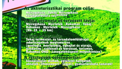 A Nyíregyházi Egyetem Ökoegyetem Csoportja, Az Eötvös Gyakorlóiskola Ökoiskolája Tokaj-Nyíregyháza kerékpárostúrát szervez. Az aktívturisztikai program célja: Nyíregyháza–Tokaj–Nyíregyháza kerékpárostúra teljesítése. A túra útvonala és tervezett távja: