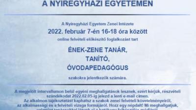 A Nyíregyházi Egyetem Zenei Intézete 2022. február 7-én 16-18 óra között online felvételi előkészítő foglalkozást tart ÉNEK-ZENE TANÁR, TANÍTÓ, ÓVODAPEDAGÓGUS szakokra jelentkezők számára.