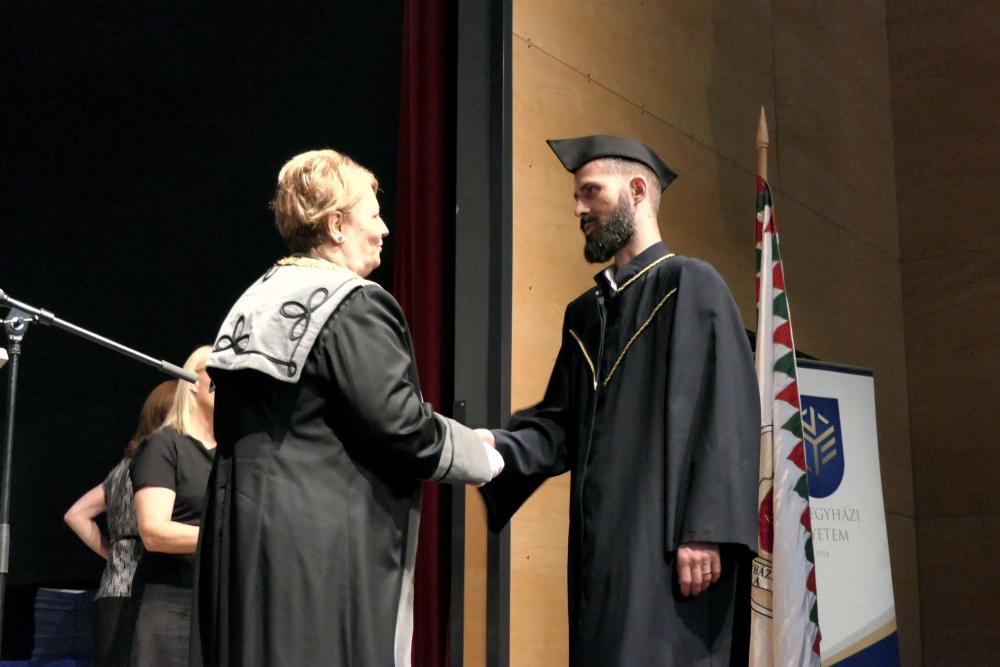 Dr. János István általános rektorhelyettes beszédében kitért arra, hogy a 2021/2022-es tanévben reagálniuk kellett a koronavírus-járvány újabb hullámára és az orosz-ukrán konfliktusra, a háborús menekültek elhelyezésére, befogadására. Az első helyen 1428 diák jelölte meg a Nyíregyházi Egyetem valamelyik képzését, összesen pedig 4401-en jelentkeztek. Az első helyes jelentkezők száma 13,6 százalékkal nőtt a tavalyi évhez képest. Országos viszonylatban a csökkenés a jellemző, tehát a beiskolázási kampányuk sikeresnek bizonyult. A következő tanévben a távoktatás is megjelenik a képzési portfóliójukban. Kiemelt stratégiai cél a tanárképzés megújítása és megerősítése az egyetemen. Az értékteremtés tetten érhető a szellemi atmoszférájukban: kollégák vehették át a kitüntetéseiket Vassné prof. dr. Figula Erikától és Halkóné dr. Rudolf Éva kancellártól, majd a végzős hallgatókat szólították, akik büszkén fogták a kezükbe a diplomájukat.