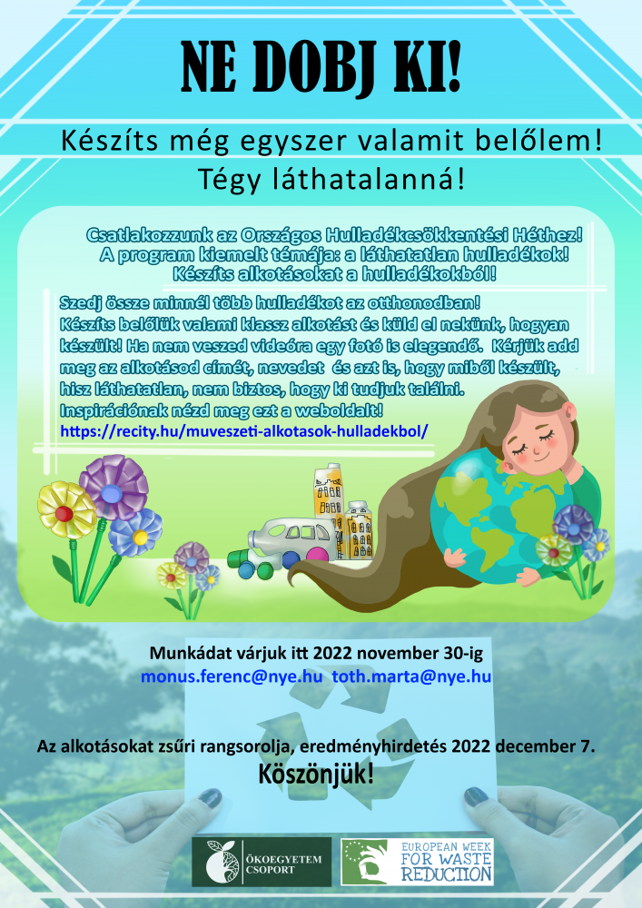 Csatlakozzunk az országos hulladékcsökkentési héthez! - kéri hallgatóit a Nyíregyházi Egyetem Ökoegyetem Csoportja. A kezdeményezéshez Ne dobj ki! Készíts még egyszer valamit! Tégy láthatatlanná! címmel felhívást is közzétettek, melyet az alábbi plakáton olvashatnak az érdeklődők.